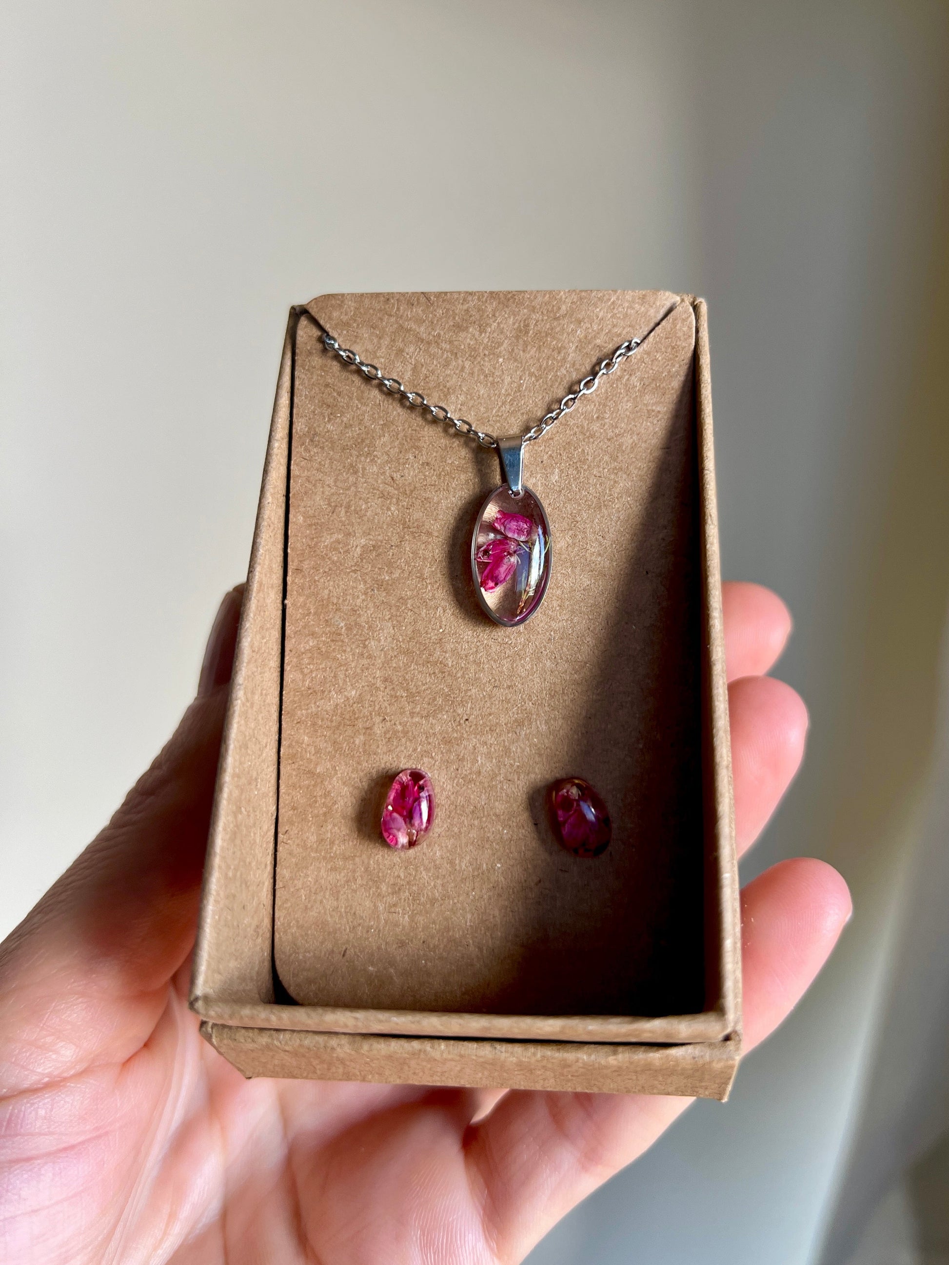 Juego de collar y pendientes, con flor de brezo.