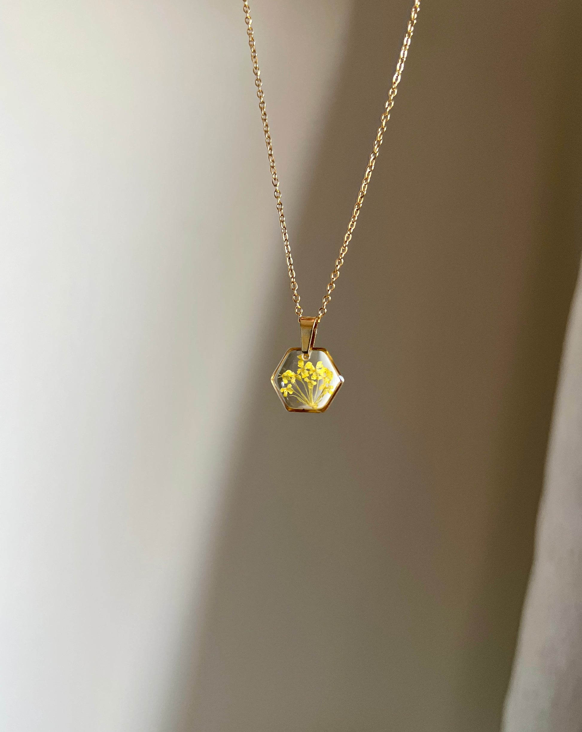 Collar hexagonal con flor amarilla.