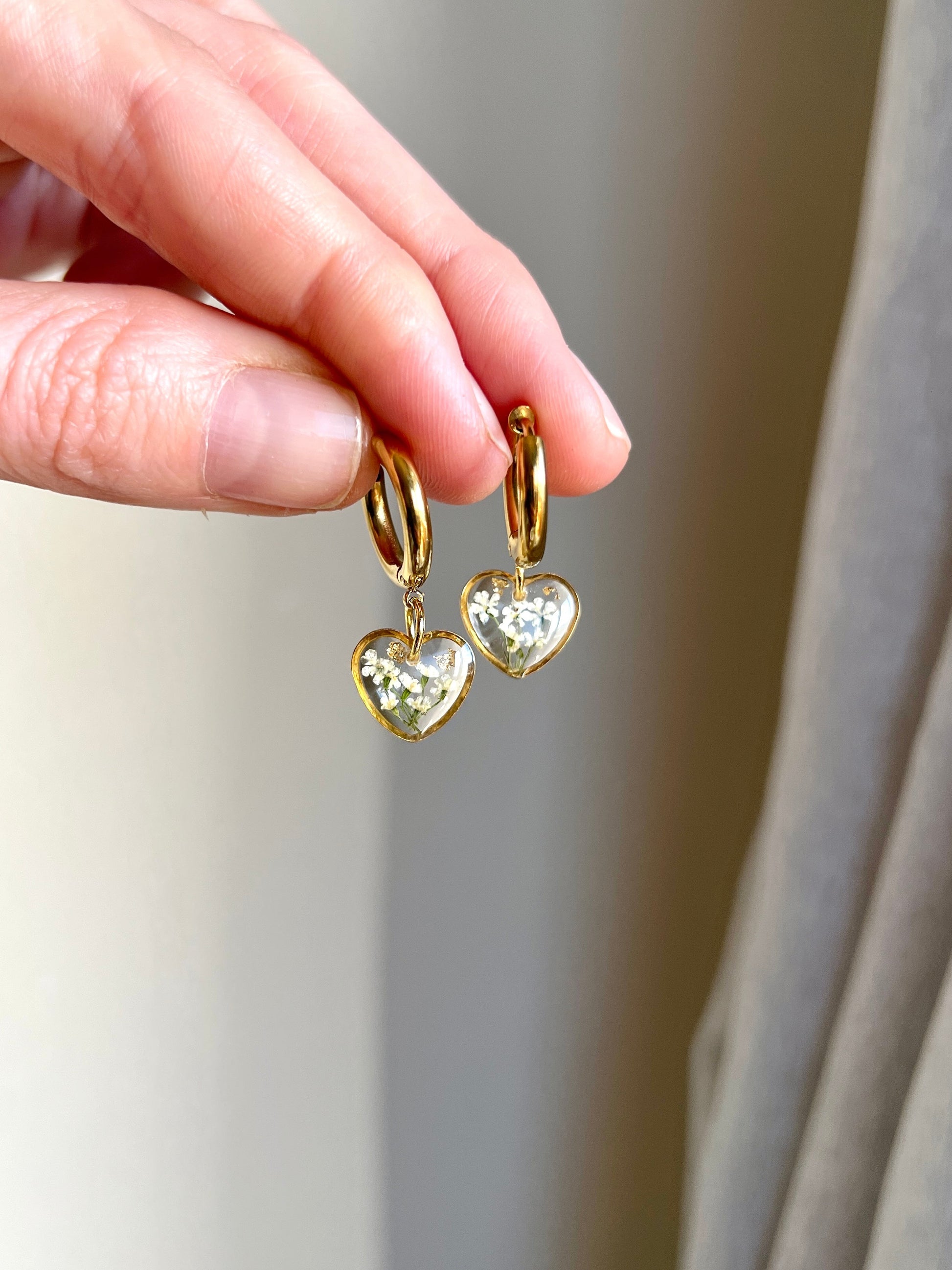 Pendientes corazones con flor silvestre blanca.