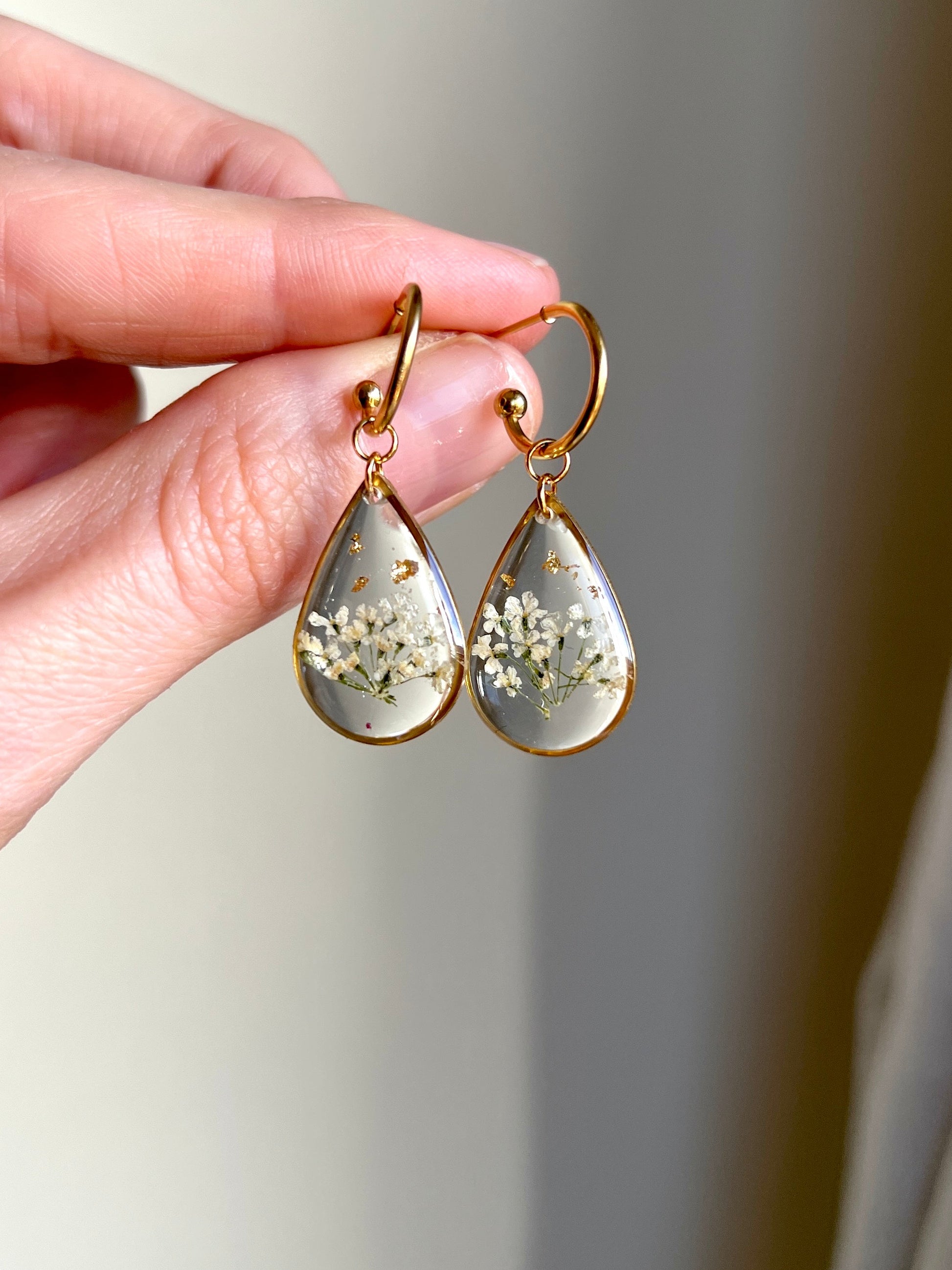 Pendientes dorados con flor silvestre blanca.