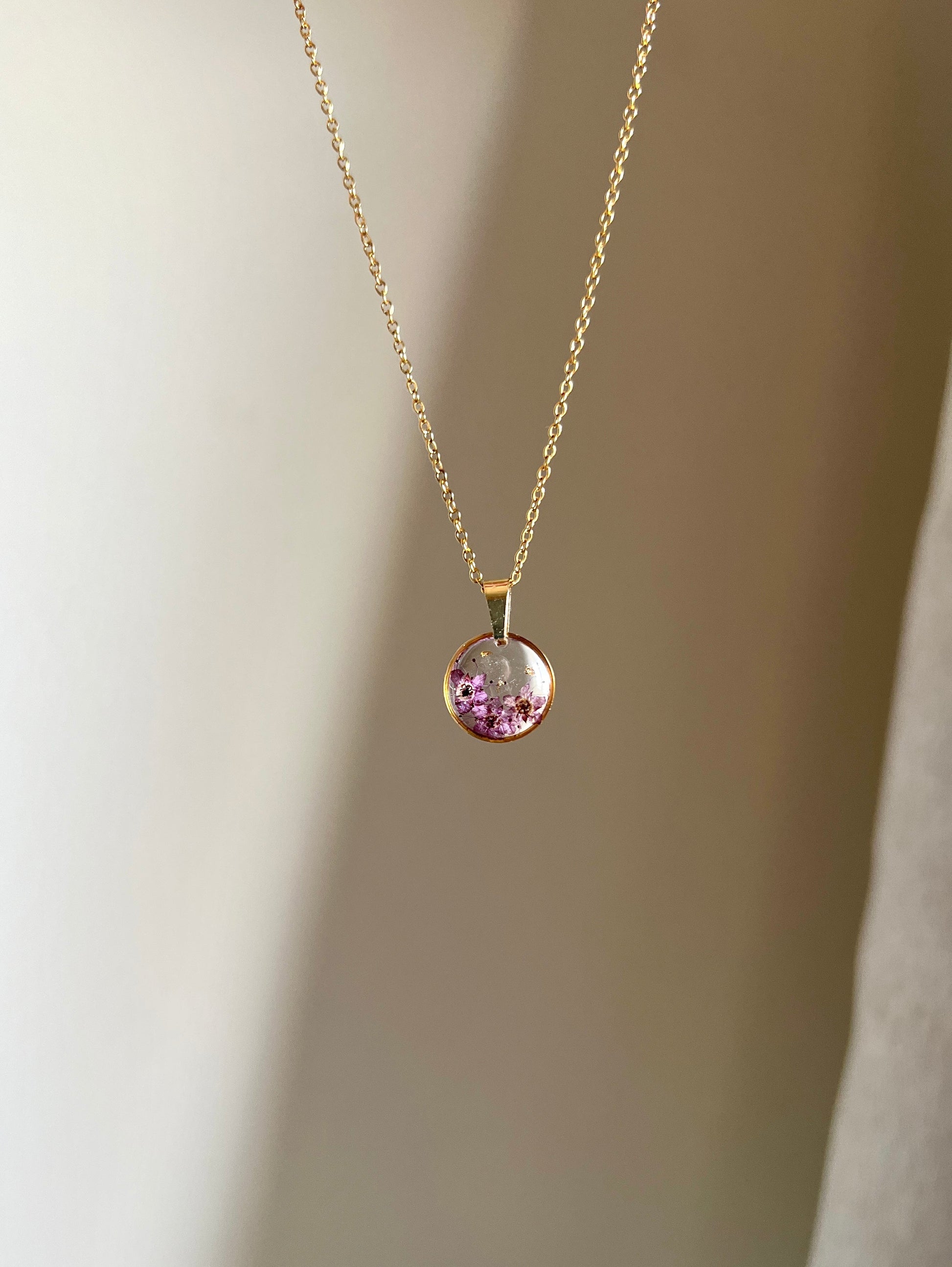 Joya hecha a mano de resina epoxy, acero inoxidable y flores naturales.