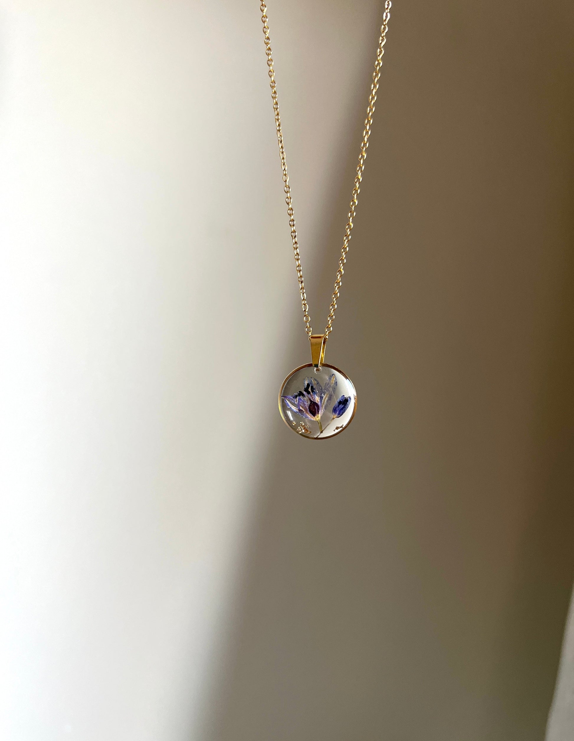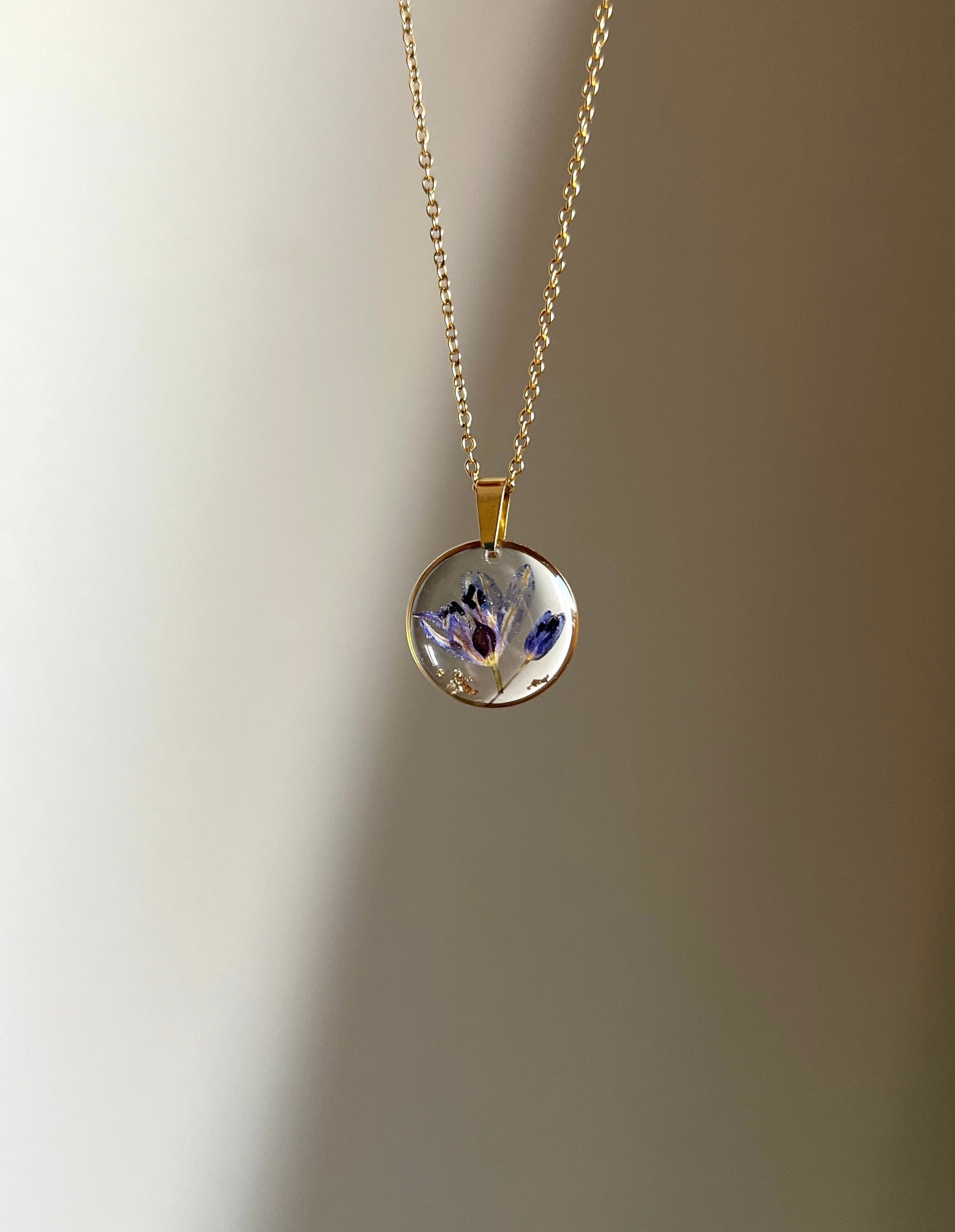Joya hecha a mano de resina epoxy, acero inoxidable y flores naturales.