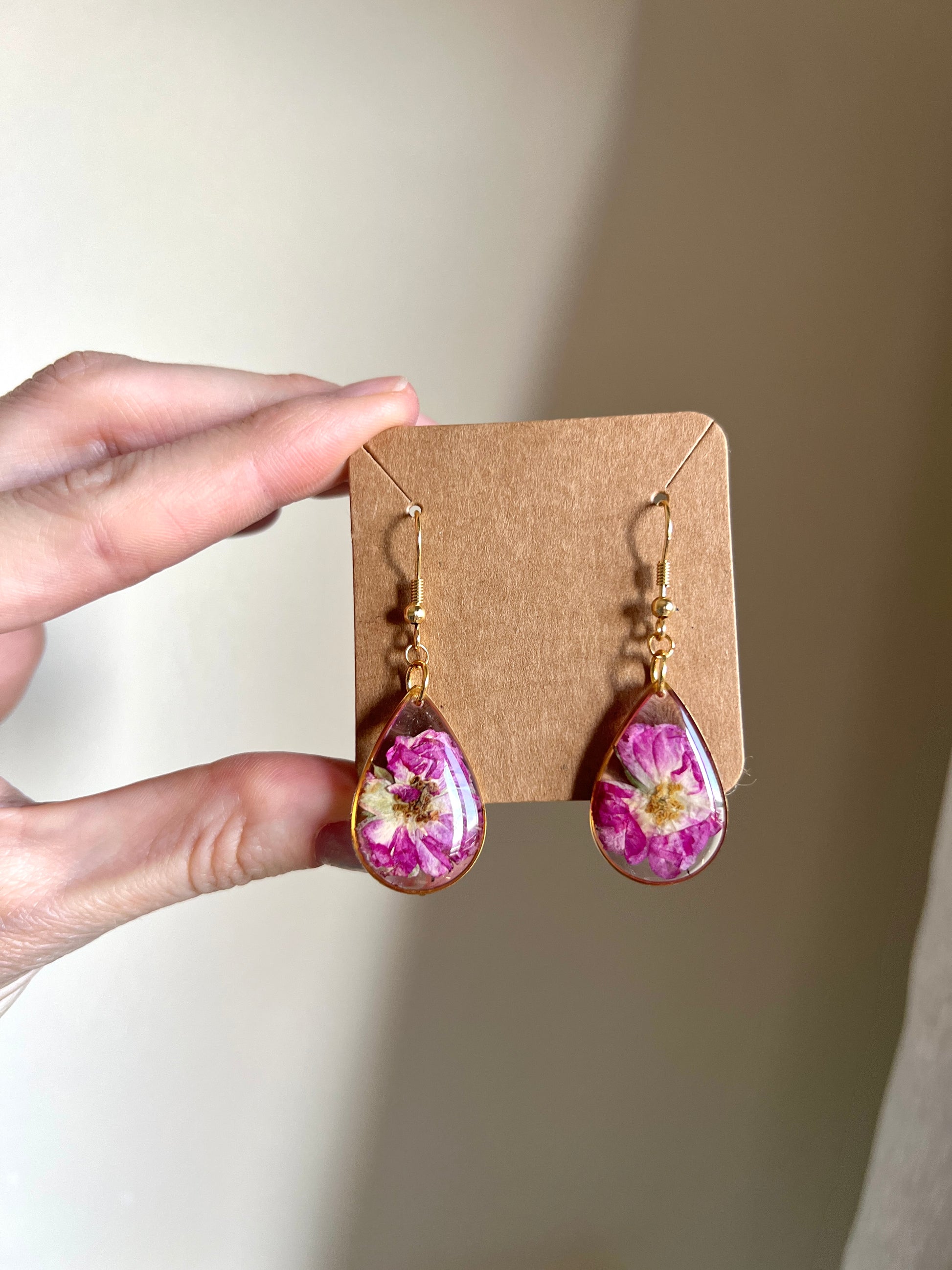 Joya hecha a mano de resina epoxy, acero inoxidable y flores naturales.